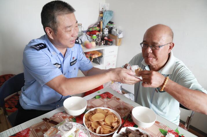 中秋团圆时,情暖老人心。虽然都是家常菜,但有了沈警官的陪伴,李爹爹满心欢喜。图片来源:武汉文明网