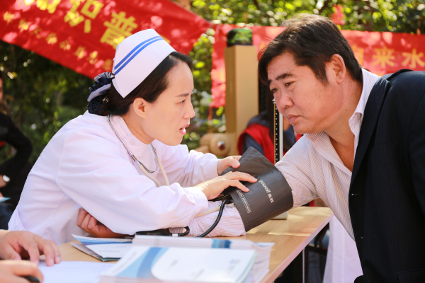 医务志愿者为居民免费测量血压。 图片来源:邯郸文明网