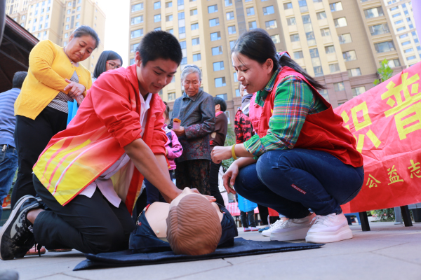 在邯郸市火柴公益志愿服务队服务点前,志愿者现场演示心肺复苏术的正确操作,引来众多居民围观。一位社区居民说:“志愿者手把手教我们急救操作,更能直观地了解和掌握自救技能。”