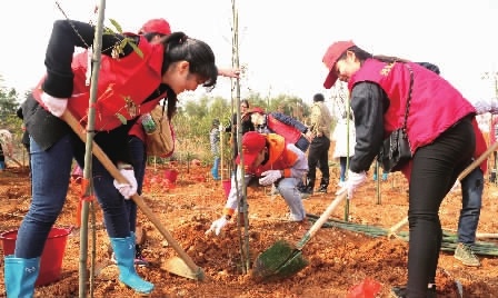 区校共建大学生志愿者在莲花镇植树基地义务植树。