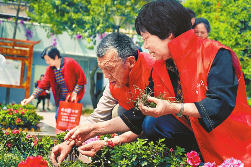 武侯区玉林街道“花开玉林”工程中,许多志愿者自愿养护花草
