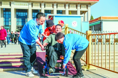 在天安门广场,周长林、吕嘉珩母子二人帮助行动不便的游客下台阶