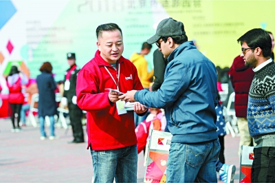在2018北京外语游园会上,周长林的儿子吕嘉珩耐心为外国人解答问题