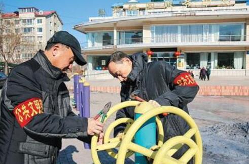 鞍山市铁东区新兴街道公共文明服务岗老党员定期上岗检修健身器材。(图片来源:鞍山日报)