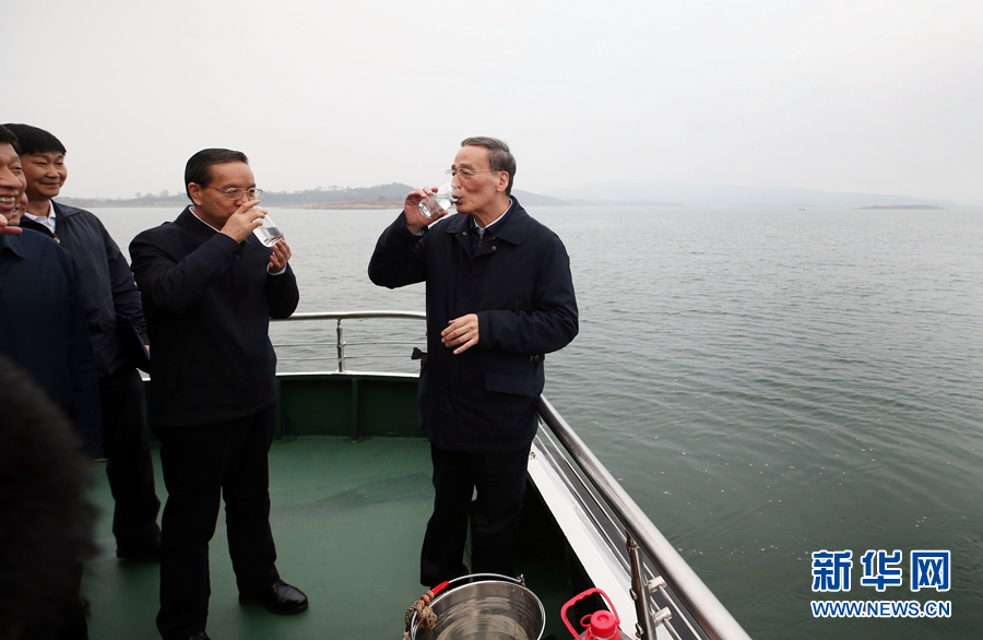 11月14日至16日,国家副主席王岐山在湖北调研。这是11月15日,王岐山乘船考察丹江口水库生态环境保护情况时试喝刚从水库打上来的清水。新华社记者 姚大伟 摄