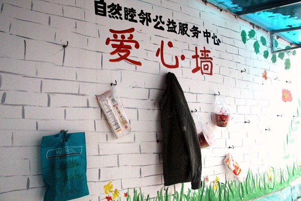 爱心墙上挂着爱心人士捐赠的爱心物资。图片来源:长沙文明网 记者 龙莉 摄
