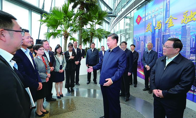 2018年11月6日至7日,中共中央总书记、国家主席、中央军委主席习近平在上海考察。这是6日上午,习近平在上海中心大厦22层的陆家嘴金融城党建服务中心,同正在联合开展主题党日活动的企业党员亲切交谈。新华社记者 谢环驰/摄