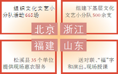 1月3日,浙江省文联文艺小分队来到杭州市萧山区义桥镇民丰村文化礼堂,为当地村民举办了一场“文化集市”。10多位书法家现场写下个性化的“福”字,并按村民需求为他们“定制”春联。22日,浙江美术馆、海宁钱君匋艺术研究馆的艺术家,走进以美术教育为特色的嘉兴市海宁中学,与师生们进行笔会交流,共同举办美术作品展,让正在学画的孩子有机会与一流艺术家直接交流、向他们请教。海宁中学也成为浙江美术馆“流动美术馆合作单位”,今后浙江美术馆的馆藏艺术品每年将定期在海宁中学展出。