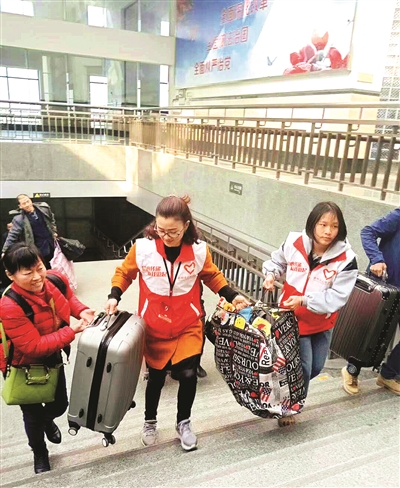 善水志愿服务总队志愿者在惠州火车站为旅客服务。