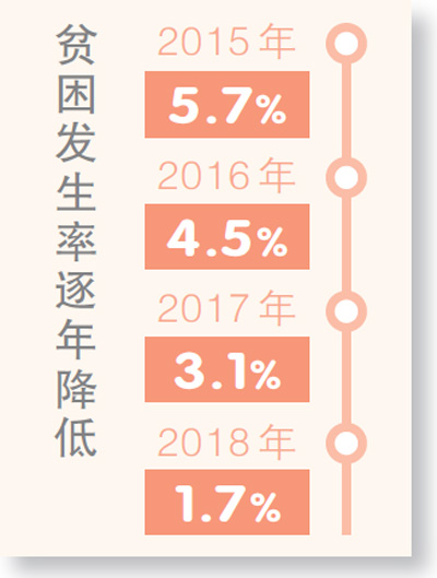 截至2018年末,全国农村贫困人口从2012年末的9899万人减少至1660万人,累计减少8239万人;贫困发生率从2012年的10.2%下降至1.7%,累计下降8.5个百分点。
