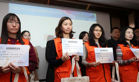 3月5日,垃圾分类巾帼志愿者接受志愿者服务证书。