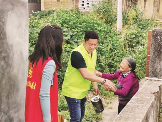 第一个送达的是横畲村廖屋95岁的老人廖天仕,这位老人独居。邹景峰和志愿者经常来为老人打扫卫生,老人很信任邹景峰,也经常像个孩子一样惹出一些小麻烦让邹景峰哭笑不得。送达时,老人还没起床,邹景峰叫了好一会儿门,他猜老人昨晚可能喝酒晚睡了。门开了,老人絮絮叨叨地跟邹景峰聊天,邹景峰像大人交代小孩子似的叮嘱老人:“你有高血压,不要喝酒了。”看到老人前一天的饭菜都吃完了,但保温桶没洗,他一边洗一边叮嘱老人:“吃完饭要记得洗碗,不然容易长虫子!”老人“嗯嗯”地答应。