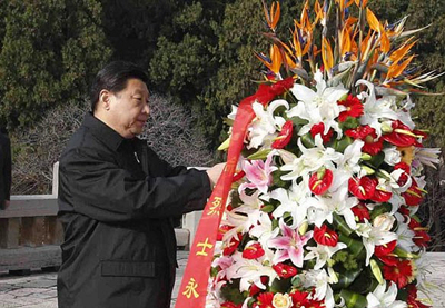2013年11月25日,习近平在视察沂蒙革命老区临沂期间,专程前往华东革命烈士陵园,向革命烈士纪念塔敬献花篮。
