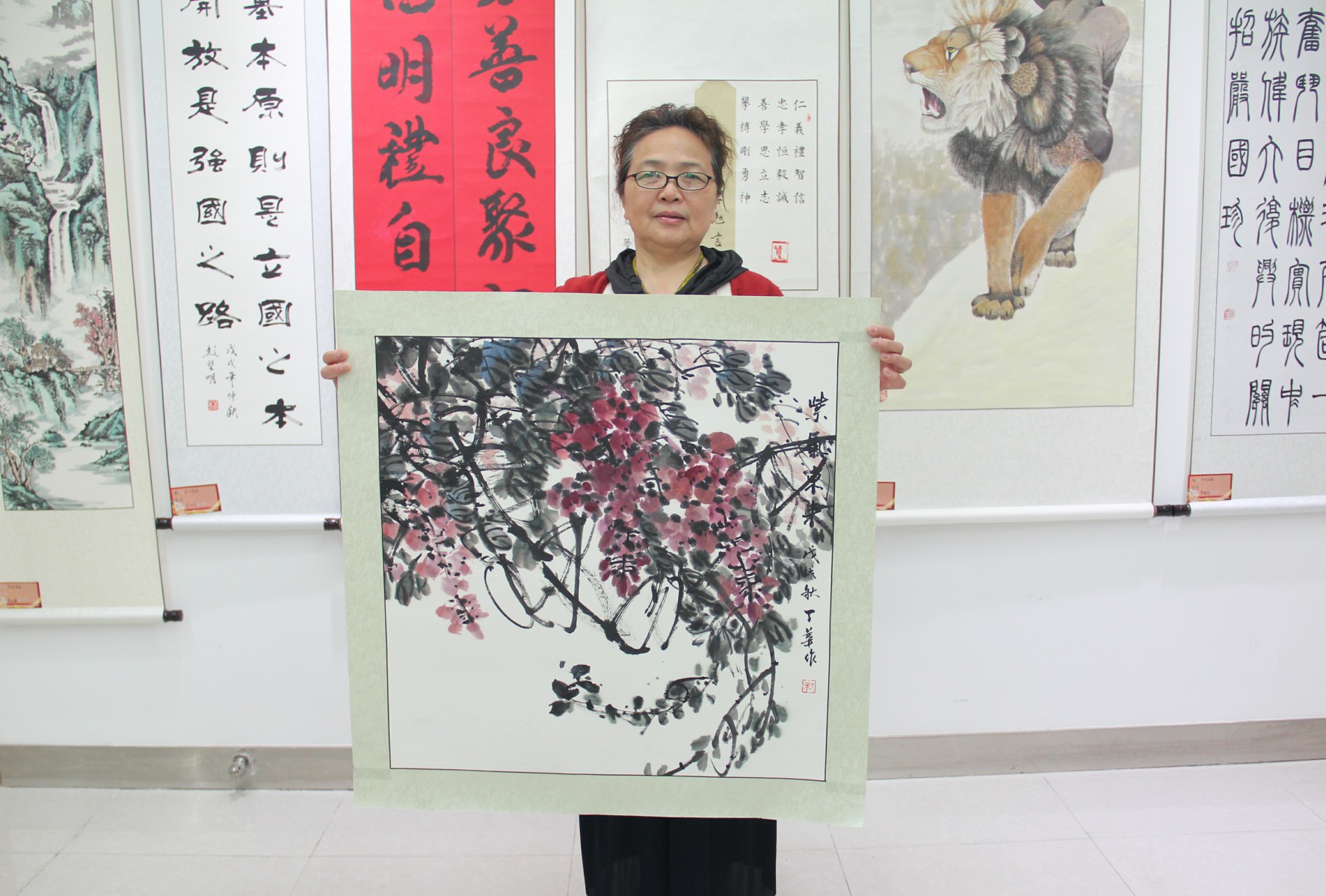 “这幅画的每一笔都流露我热爱祖国和对美好生活的向往!衷心祝福我们的祖国万紫千红总是春,祖国永远屹立于世界的前列!”当被问到为“我和我的祖国”社区书画大赛准备了什么作品时,丁华拿出绘画作品《紫气东来》,“这幅画寓意祖国祥和美好,繁荣富强,人民生活越来越好。”意境简洁,个性鲜明,丁华老师的作品风格独树一帜。