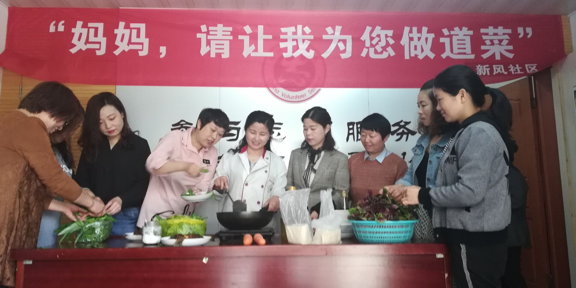 在母亲节到来之际,花木兰志愿者在社区开展“妈妈,请让我为您做道菜”活动,活动前,队长蔡花珍清晨5点多,带着志愿者到菜场买新鲜的蔬菜等,每位志愿者拿出自己的烹饪手艺,做了满满两桌子菜,特意请来了社区的女性孤寡老人、空巢老人一起品尝、过节。在现场,年轻的妈妈和花木兰志愿者给年老的妈妈合唱一首《拉着妈妈的手》,每个人眼里含着泪花,脸上又流露出幸福的笑意,89岁的孤老张奶奶说:“今天这么多女儿给我过节,我太高兴了。”
