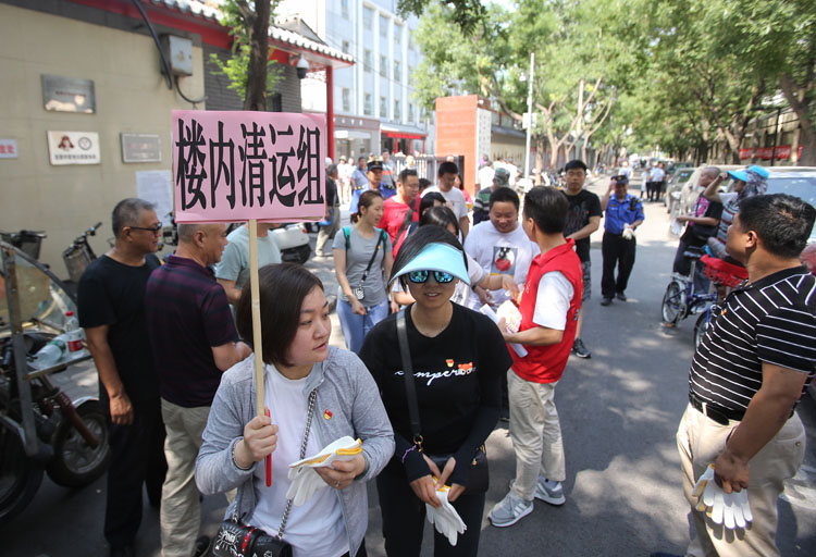 楼内清运组志愿者集合,准备清理楼道。