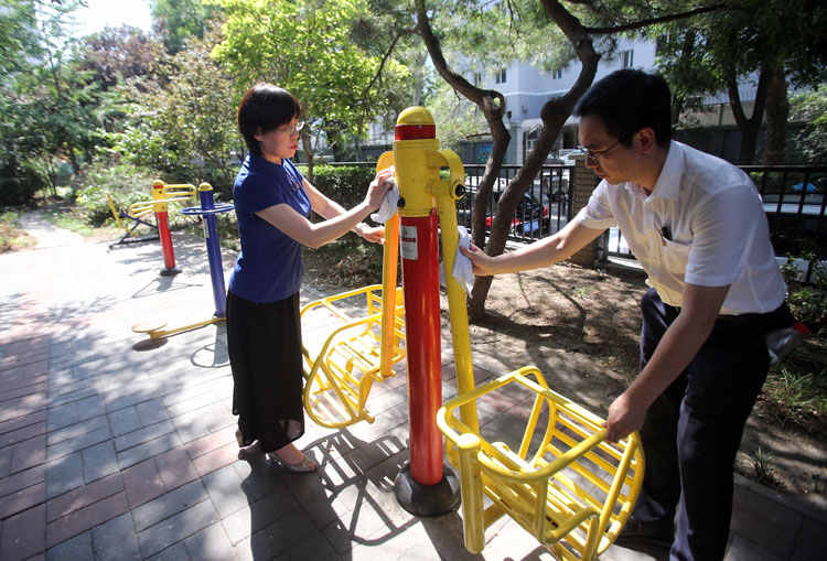 志愿者擦洗小区内健身器材。
