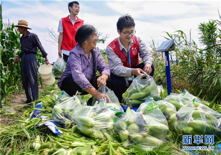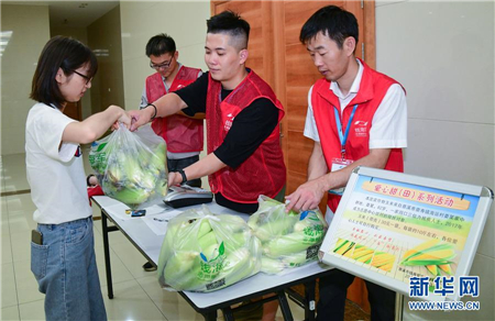 6月24日,青年党员志愿者在当地一家公司内义卖低保户收获的玉米。 新华社记者 徐昱 摄