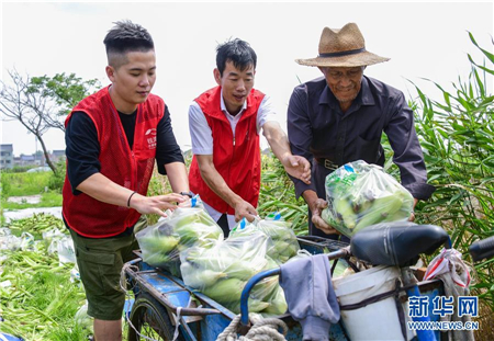 6月24日,青年党员志愿者帮助82岁的娄杏金老人(右一)收玉米并装车。新华社记者 徐昱 摄