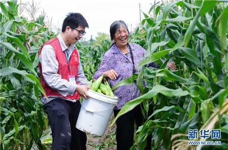 6月24日,青年党员志愿者帮助77岁的低保户鲁彩球(右)收玉米。新华社记者 徐昱 摄