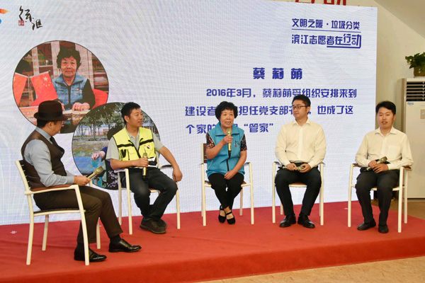 市文明办志愿服务工作处副处长、市志愿者协会副秘书长俞伟,区委组织部副部长、区委党史研究室主任周晨蔚,龙华街道党工委副书记、办事处主任张军等共同点亮滨江建设者“七彩志愿心”,并向滨江建设者志愿服务队代表赠送《垃圾分类市民读本》工具书,鼓励建设者们推动“新时尚”向建筑工地、食堂和宿舍等延伸,共筑美好家园。