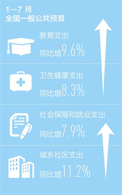 这背后,是国家真金白银的投入。今年1—7月累计,全国一般公共预算支出中,教育、卫生健康、社会保障和就业、城乡社区分别同比增长9.6%、8.3%、7.9%和11.2%。