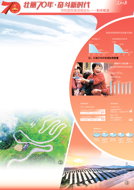 如今,中国特色的脱贫攻坚制度体系基本建立,责任体系、政策体系、考核体系等构建起顶层设计的“四梁八柱”。精准施策,对症下药,贫困地区迎来了历史性的跨越和巨变:70年间,全国贫困发生率大幅下降,到2018年底降至1.7%。透过数字看变化,腰包更鼓了,贫困地区农民收入近6年年均增长12.1%,增幅高于全国平均水平;条件更好了,99.5%的村通了硬化路,96.5%的村通了客车,改水改厕等让村庄更加宜居;生活质量高了,近6年贫困地区农民人均消费支出年均增长11.4%。