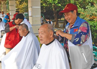 有队员坐40分钟公交车赶来 除了本社区的老人,服务队还吸引了外社区的老人。82岁的吴长清住在酒仙桥街道南路社区,听说银龄服务队的事迹后十分感动,找到郝淑英,加入了服务队:“我自己也有点手艺,跟外面美发店比不了,但是推圆寸可是一绝。”