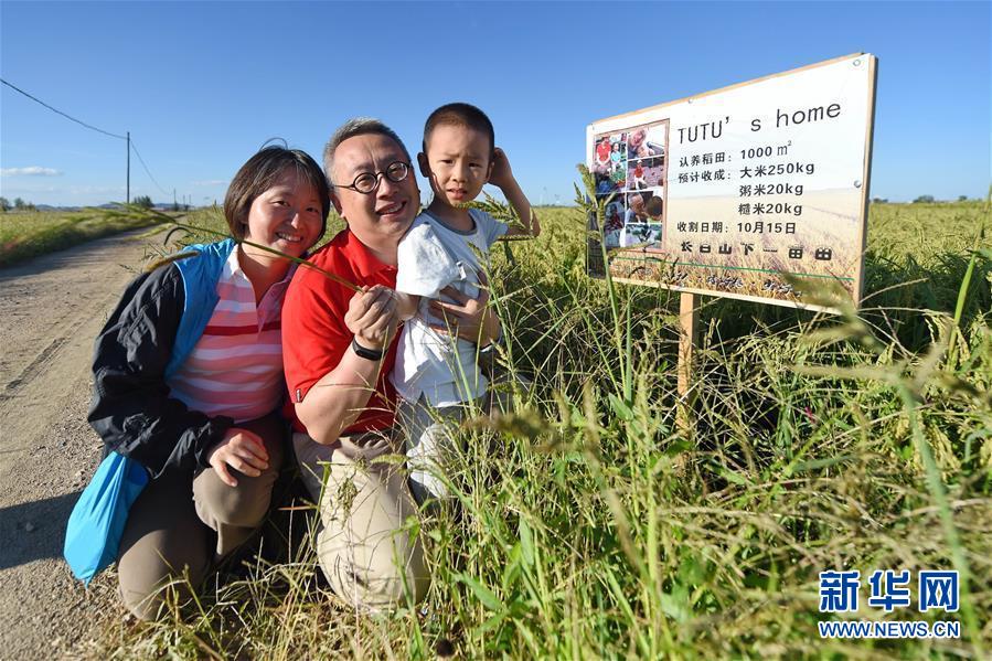 2016年8月29日,在吉林辉南县兴德村一处农场,一家来自北京的客户在自家定制的稻田前留影。新华社记者 张楠 摄