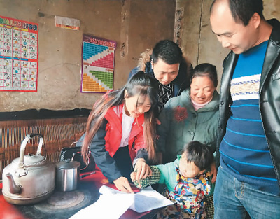 “童伴妈妈”项目志愿者吴红梅(左)和村干部、志愿者回访留守儿童,并跟家长签订留守儿童监护责任书。 受访者供图