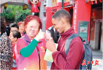 20日上午,天气晴好,在江岸区吉庆民俗街,一群外国游客在这里体验民俗文化。人群中,一位穿着红色马甲的“大妈级”志愿者正在用英文,向外国游客推荐武汉的美食与景点。