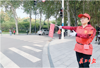 早上7点半,55岁的吴君巍穿着红马甲、臂戴红袖章、手执“迎军运 讲文明”小红旗,准时到达劳动街道辖区惠济路口,开始一天的志愿服务工作。