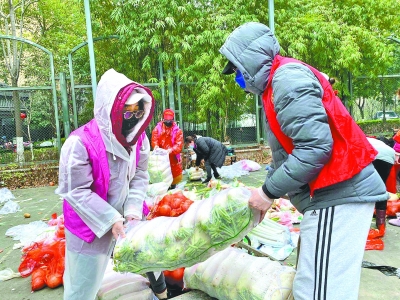 “90后”夫妻一起当志愿者 3月24日8时,一辆装满蔬菜的货车停在幸福时代四期门口,范炜和边策这对“90后”夫妻志愿者上前接应,一个负责对照物品名单,一个负责卸货核对,再一一进行分发。