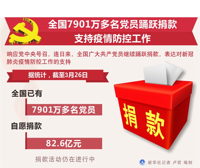 响应党中央号召,连日来,全国广大共产党员继续踊跃捐款,表达对新冠肺炎疫情防控工作的支持。据统计,截至3月26日,全国已有7901万多名党员自愿捐款82。6亿元。捐款活动仍在进行中。