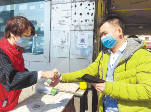 3月26日,在湖北襄阳市万达广场入口,工作人员为市民测量体温,市民出示湖北健康码“绿码”。新华社发(谢剑飞 摄)