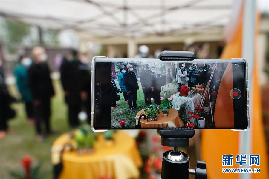 3月13日,在江苏南京市雨花台功德园,工作人员在对骨灰安放前的追思会进行视频直播,为一名不能到场的家属提供便利。这名家属是抗疫一线医护人员,目前在家隔离。新华社记者 季春鹏 摄