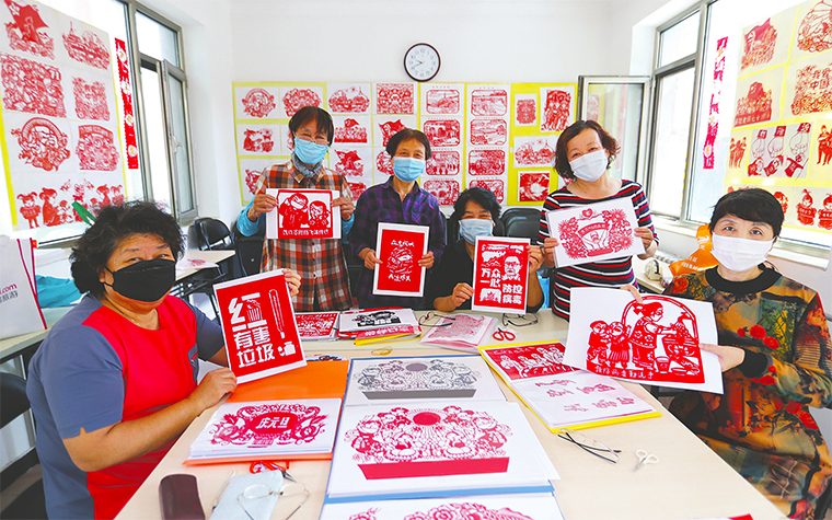 剪纸“讲述”抗疫故事 2020年春节,一场疫情打破节日的喜悦,全国上下同心协力,齐抗病毒。看着日益严峻的抗疫形势,剪纸班成员孙淑芬和老姐妹们坐不住了,想要为抗疫作些贡献。她们决定剪纸抗疫,为疫情防控一线的战士加油鼓劲。随之,一幅幅作品通过微信群、社区报、公众号在三里屯地区流传开来,带给大家无声的力量。“虽然我们不能亲赴‘疫’线,但希望用自己的方式支持抗‘疫’。”大伙儿说道。