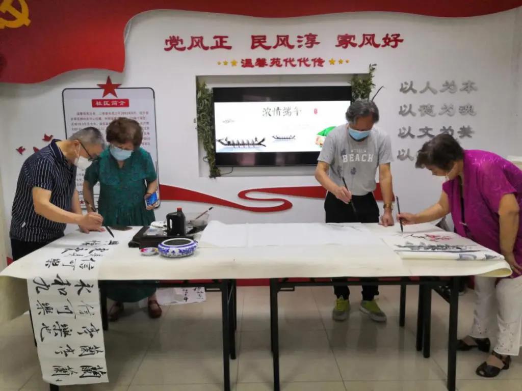 志愿者自制香包 寄托浓浓家国情 “划龙舟有两种形式,一是划龙船,二是斗龙船……”二居委会端午楼栋文化活动现场,“睛野黄花” 翰墨书画志愿服务队现场书写字画,为大家介绍端午节日习俗与文化内涵。工作人员和志愿者们保持着安全距离,捋粽叶、填糯米、压紧实、扎捆线,巧手翻飞,不一会儿功夫,一只只各式各样的漂亮粽子瞬间成型。