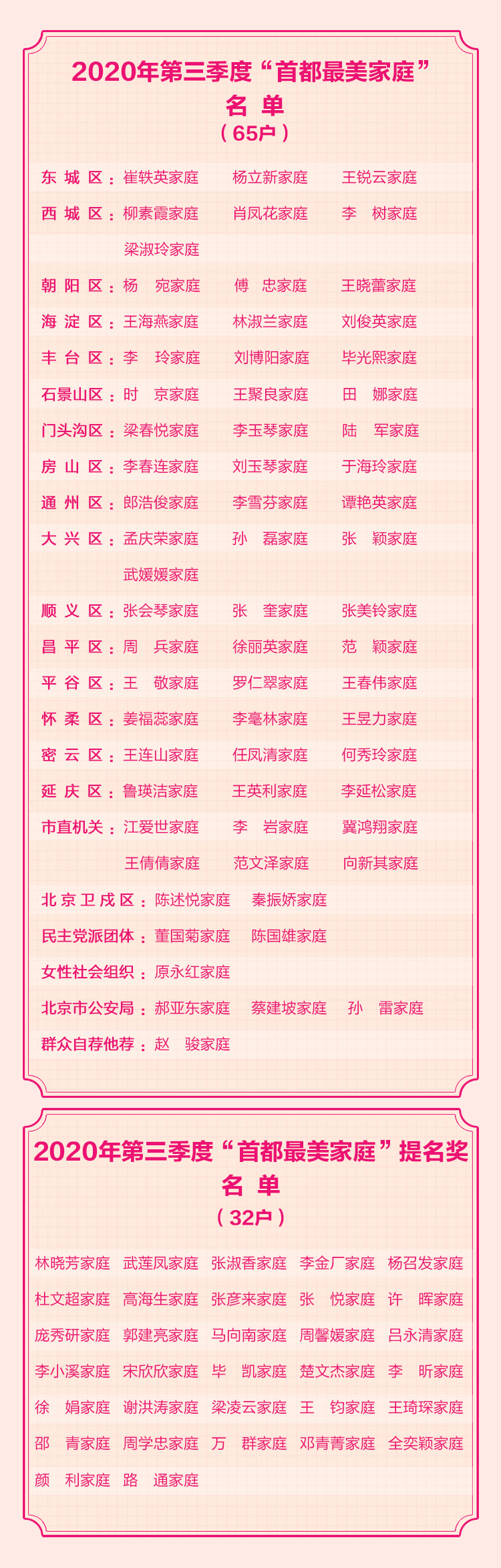 日前,由北京市委宣传部、首都文明办和北京市妇联共同主办的“与幸福同行——2020年寻找首都最美家庭”活动第三季度“首都最美家庭”榜单发布。身体力行,以“小家”带“大家”践行垃圾分类的王海燕家庭,致力于脱贫攻坚的门头沟区清水镇天河水村第一书记李树家庭,十年如一日积极投身社区志愿服务的柳素霞家庭,打造美丽庭院、以花为媒和谐邻里的李春莲家庭等65户家庭榜上有名。