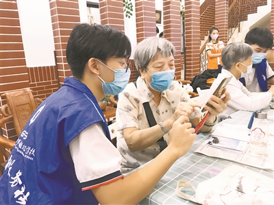 大东街社工站,志愿者在教长者使用穗康码。