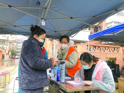 同样连续值守在小区内的,还有街道干部、社区干部、物业工作人员、志愿者等一线人员。临江新村居民区主任邓燕霞顶着一双黑眼圈告诉记者,“自22日早晨起,一线工作人员就紧张忙碌起来,先是全面走访,喊喇叭向居民宣传当前的情况,然后协助社区卫生中心医生准备核酸检测现场,再挨家挨户上门告知检测的相关流程。小区所有人家跑下来,就要几个小时。完成准备工作后,又要马不停蹄地赶到检测点,维护采样现场的秩序。因不少居民还在陆陆续续返回小区,23日3时,我们还在陪居民进行核酸检测。”