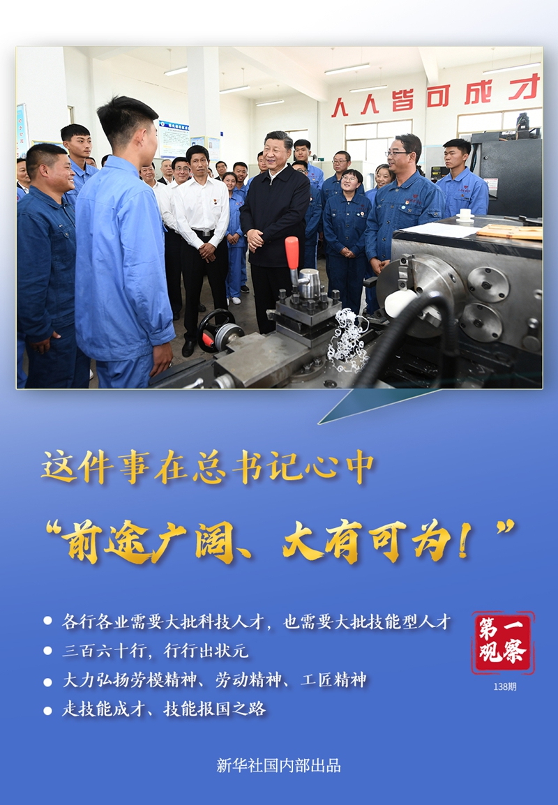 “要树立正确人才观”。习近平总书记反复强调培养技术技能人才的重要性,还多次走到老师和同学们中间,为大家加油打气。