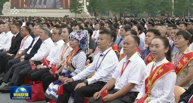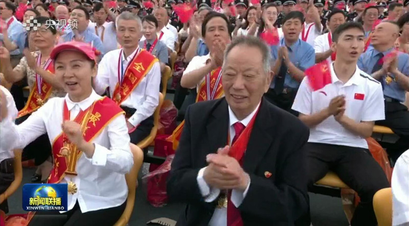 王波(前排右一)在庆祝中国共产党成立100周年大会现场 新闻联播视频截图
