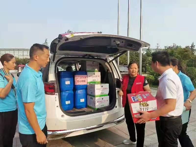 7月27日,全国最美志愿者、洛阳市人大代表、洛阳市好人颂社区艺术团团长曹建淼亲赴鹤壁市桥盟街道,向灾区捐赠了价值4万余元的纳米银离子消毒液以及矿泉水等物品。