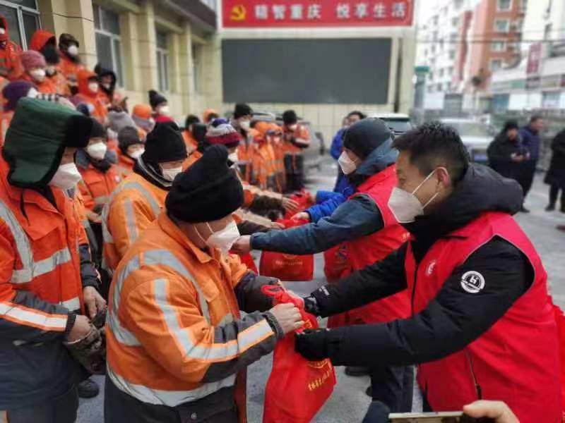 14日,农历小年,长春市朝阳区重庆街道党工委协同吉林省吉先锋退役军人志愿者服务队开展为环卫工人送“暖心包”活动,为环卫工人送上帽子、手套、暖手贴、暖脚贴等防寒物品。