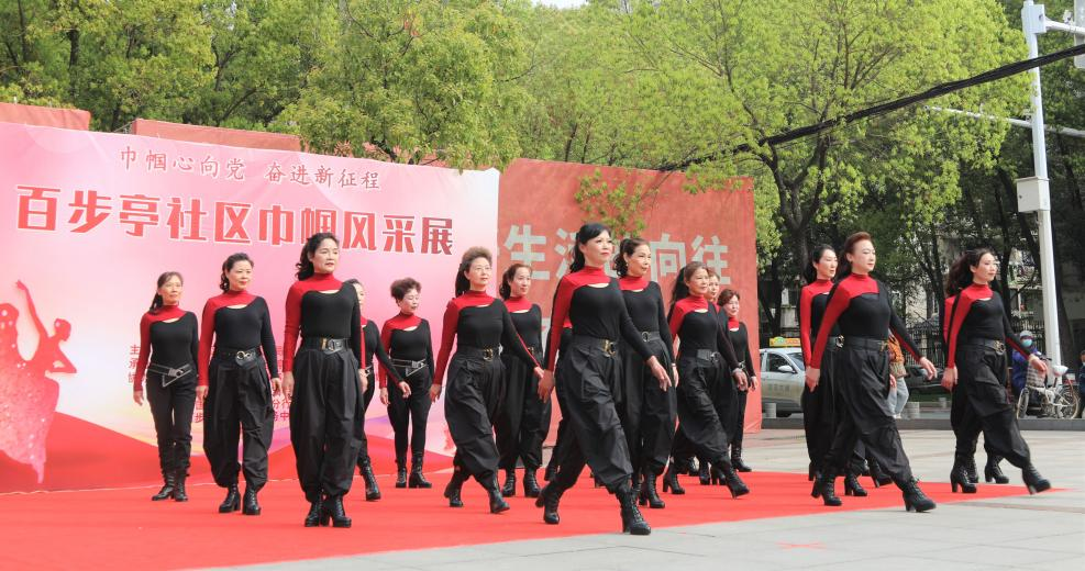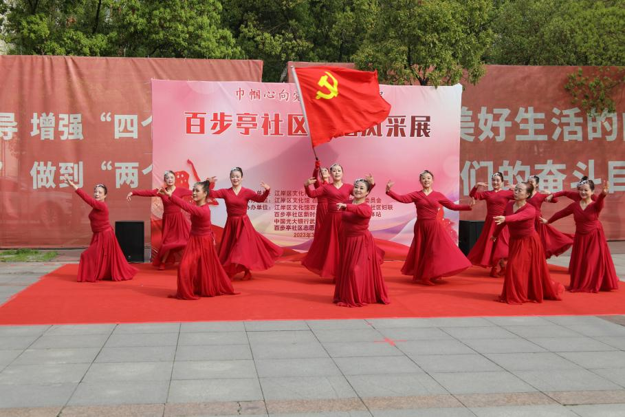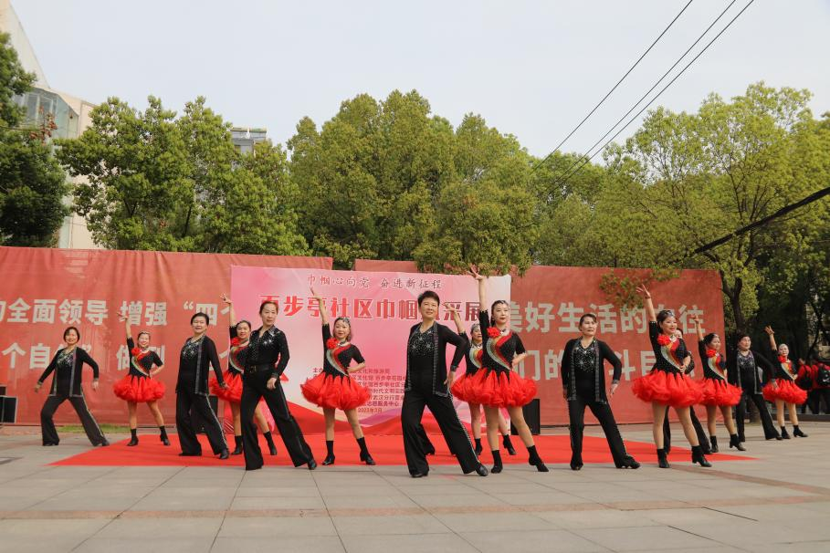 《党旗飘扬的地方》音乐一响,社区艺术团舞蹈队的队员们身穿鲜艳大红色连衣裙,用她们自信的舞姿展现妇女风采。