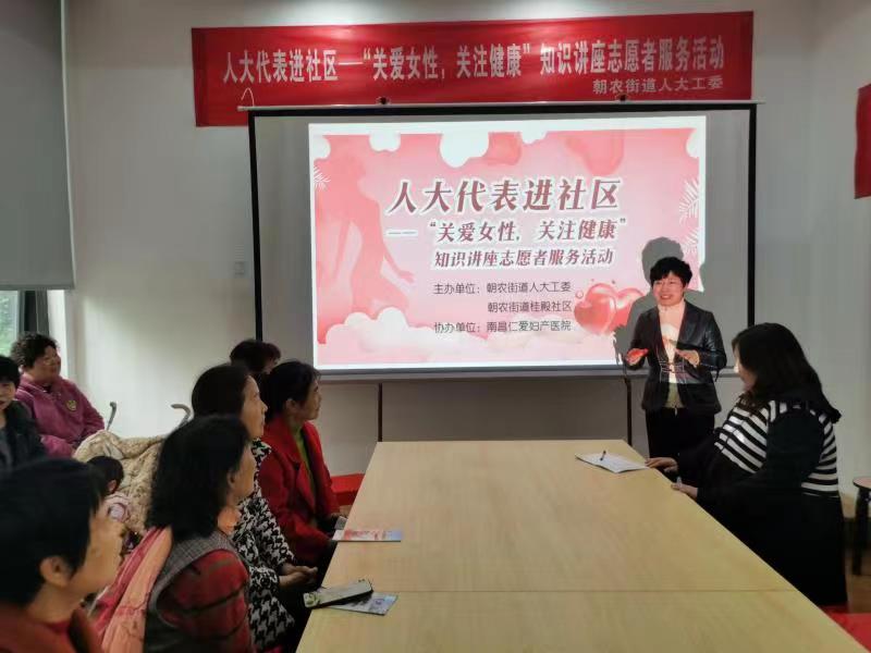 为关爱妇女健康,提升广大妇女健康意识,宣传健康理念,使健康文化融入日常生活中,近日,江西南昌市西湖区朝农街道人大工委在桂殿社区开展“关爱女性关注健康”知识讲座,邀请区人大代表、南昌市仁爱女子医院院长李蕾为辖区妇女授课。