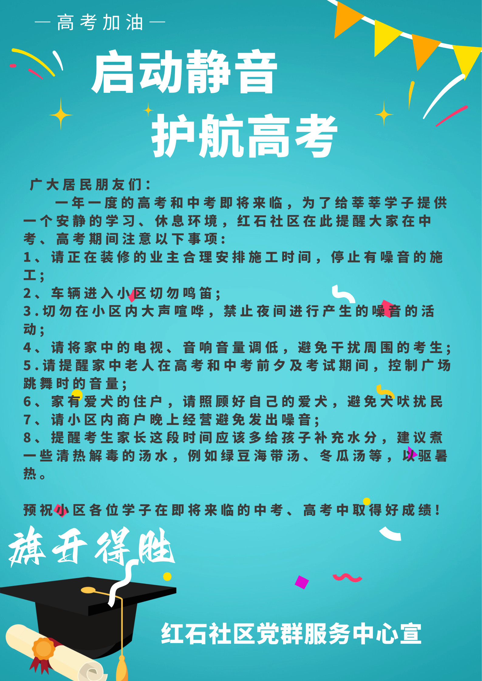 线下,红石社区新利体育在线官网首页入口站志愿者们采取在居民小区走访入户的方式在人群较为密集的地方进行倡议宣讲,倡议广大车主绕开考点主干道、不鸣笛、绿色出行;建议周边门店降低音量、减少噪音;还特别针对在辖区内锻炼的各个文艺队伍进行了沟通,劝导他们在高考期间停止活动,并要求各个工地停工,保证环境安静,给高考学子助力。