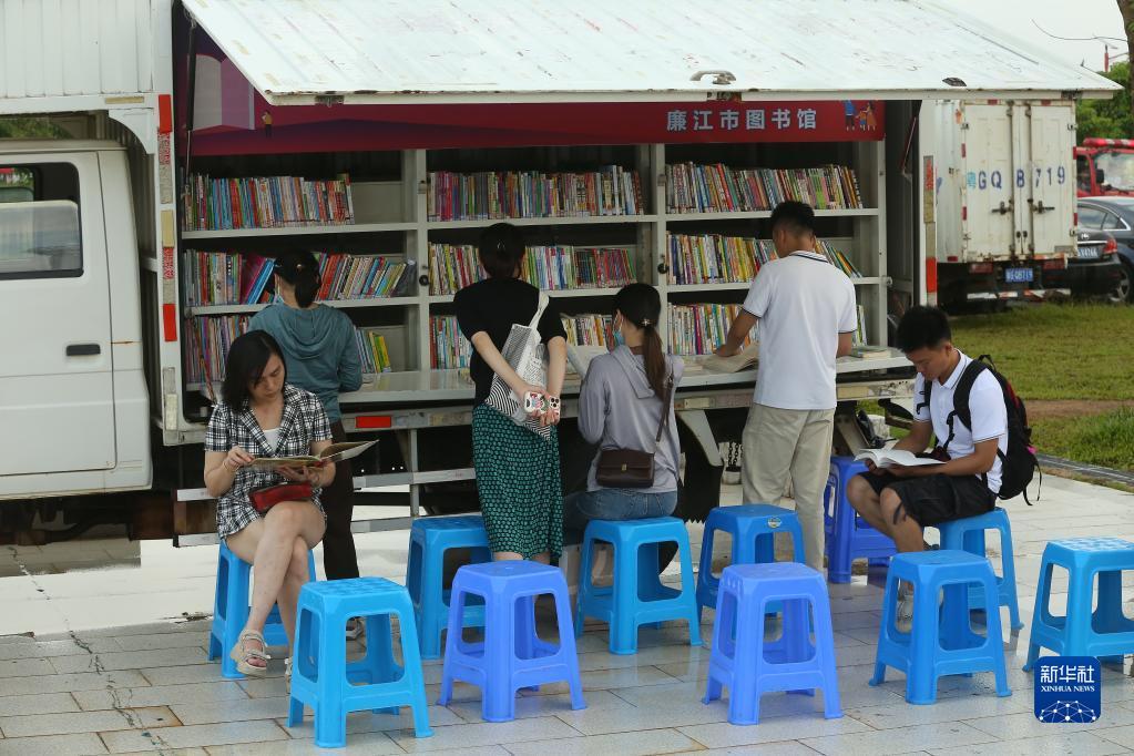 6月13日,人们在广东省廉江市“文明实践大篷车”进基层志愿服务活动现场的流动图书馆前阅读。