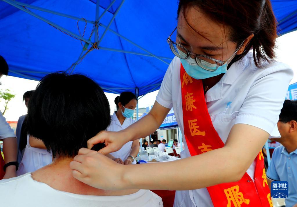 6月13日,在广东省廉江市“文明实践大篷车”进基层志愿服务活动现场,志愿医务人员为基层群众提供中医服务。